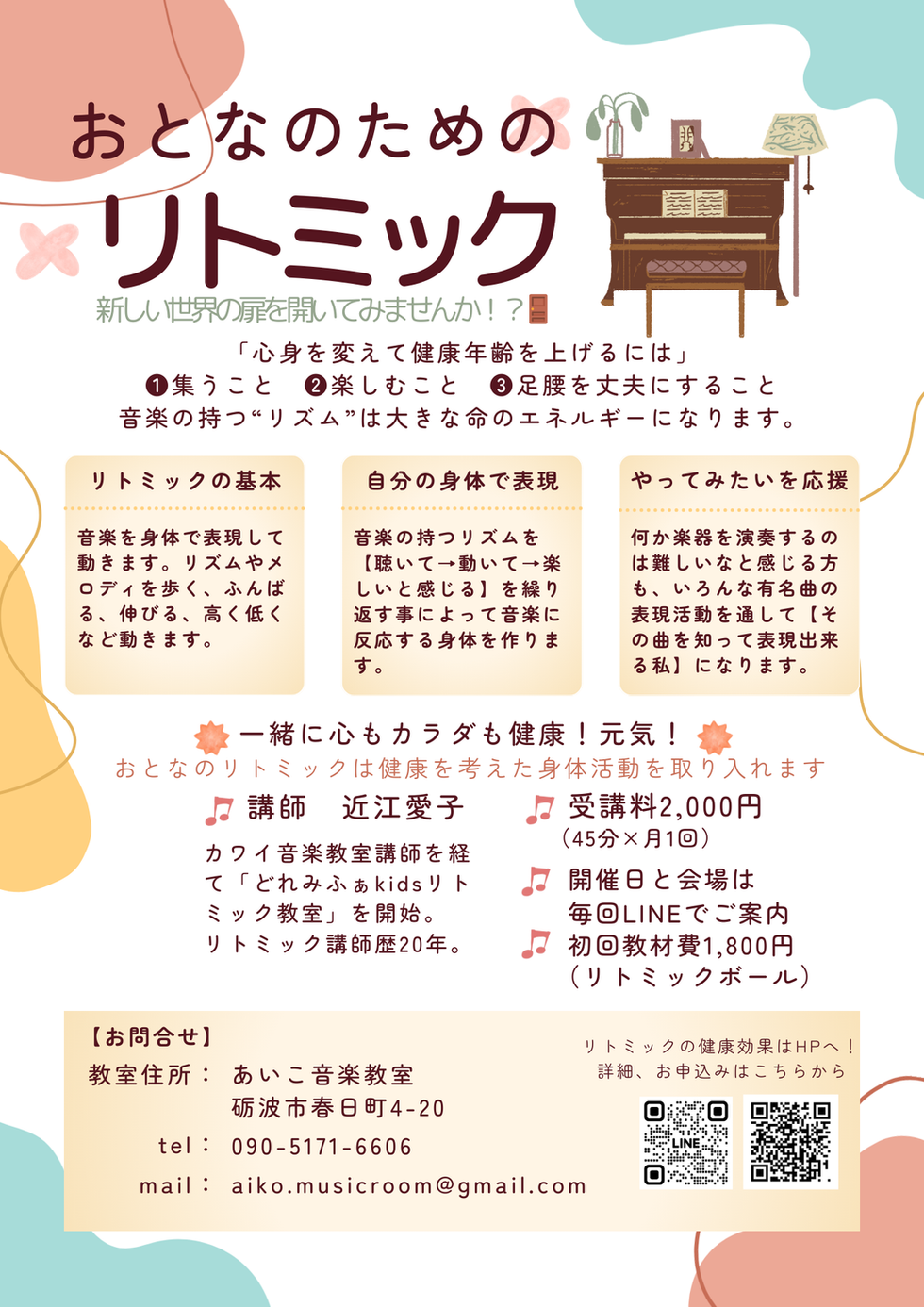 音楽に合わせて身体を動かしましょう! 心もカラダも元気にする、健康を考えたおとなのためのリトミックです。 お友達もお誘いあわせの上、ご参加お待ちしております。 公式LINEでもお知らせが届きます。 会場: 砺波市文化会館 練習室2(2階) 持ち物: 水分補給のための飲み物 汗対策のタオルなど *動きやすい服装とシューズで ご参加ください。